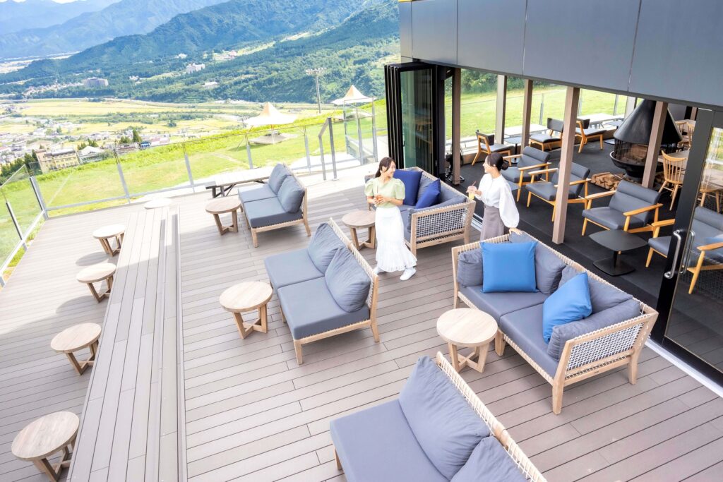 石打丸山スキー場中央口のゴンドラ乗り場から「サンライズエクスプレス」で約7分、スキー場の中腹に2022年にオープンした展望スポット。床面積232㎡とエリア最大級の広さを誇る「グランドテラス」からは、穏やかな田園風景をはじめ、日本百名山に数えられる巻機山や越後三山などの開放感あふれる眺めを満喫できる。テラス内にはゆったりと寛げるソファ席やテーブル席、景色と一体化できるフォトスポットもある。