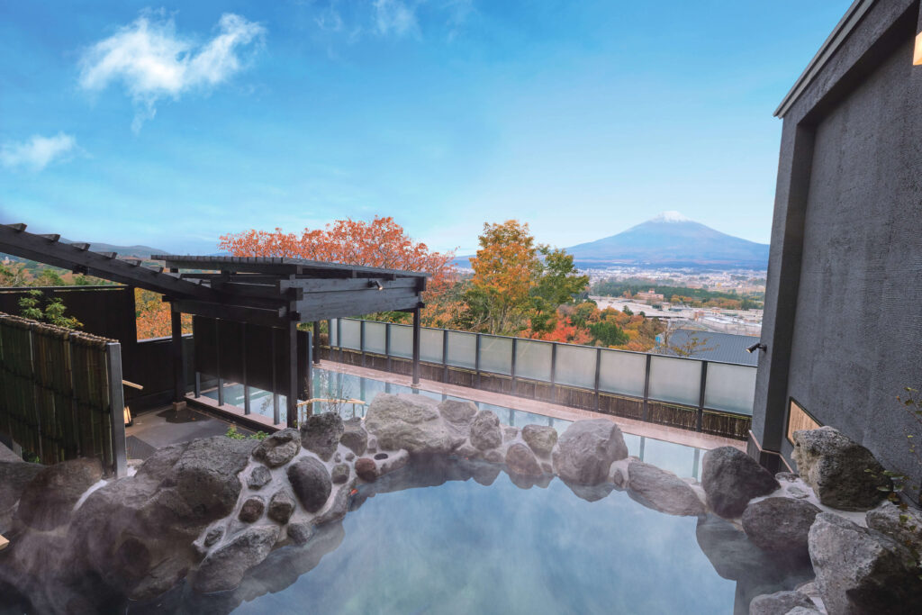 「御殿場プレミアム・アウトレット」の敷地内にある温泉リゾートホテル。半数以上の客室をはじめ、ロビー、露天風呂、お食事処などから富士山の絶景を楽しめる。さらに宿泊者は、ホテル併設の自家源泉日帰り温泉施設の「木の花の湯」も無料で利用できる。食事は「ダイニング花衣」にて。朝食、昼食、夕食すべてがビュッフェ形式で、静岡おでんや三島コロッケなどの静岡のご当地グルメも取りそろえる。周辺観光の拠点としてもおすすめだ。