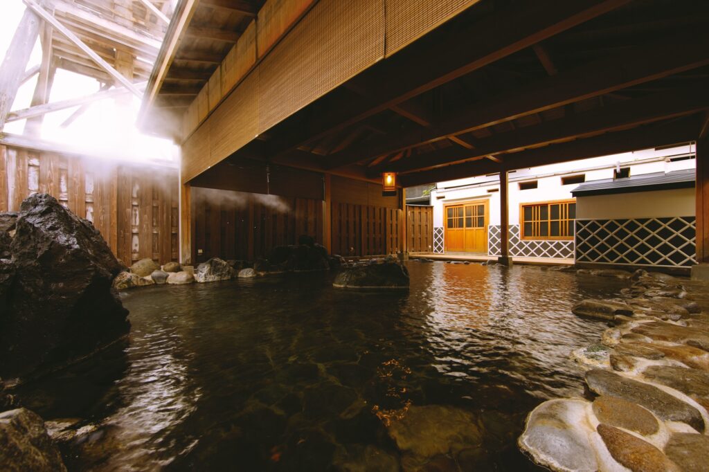 1926(大正15)年創業の老舗温泉旅館。創業者が創業と同年に掘り当てた自家温泉を源泉かけ流しで堪能できる。特に、館最大の大岩露天風呂「吹花(すいか)」では、湧き上がる温泉の地響きのような音をBGMにダイナミックな湯浴みが可能だ。本館の前に広がる廻遊式の日本庭園も必見。夜はライトアップされた庭園を星空が包み込み、幻想的な光景に出会える。伝統的な和食に洋の技法を融合させた新日本料理にも注目。